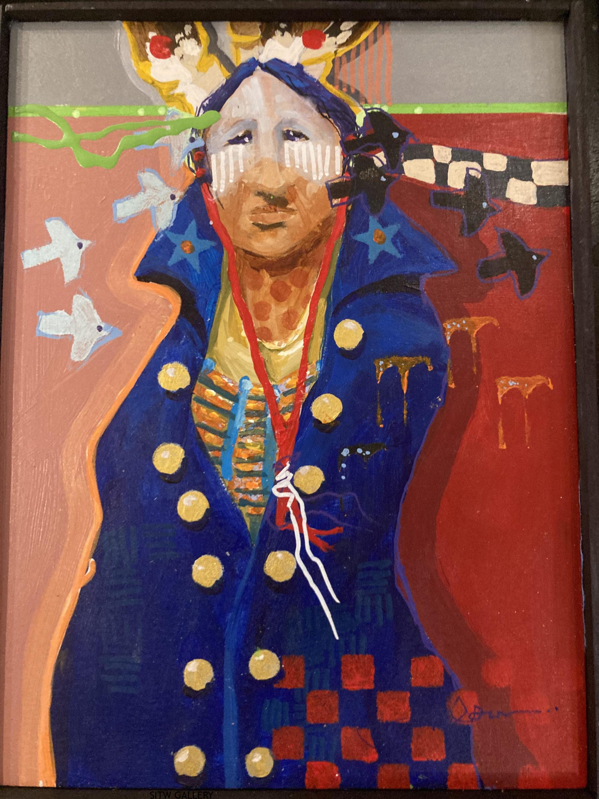 All pieces depict figures of Lakota Sioux Folklore ; colors, patterns, and shapes all have sacred meaning. These pieces are powerful in their depiction of spirit and tradition.
