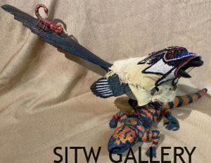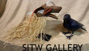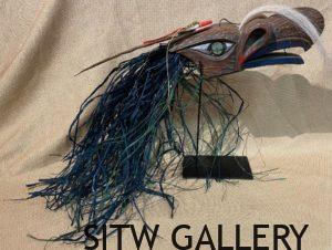 All sculpture created by David Caricato is hand carved wood and adorned with a removable hand carved or leather mask. Each raven wears a beaded bracelet hallmarking his work.